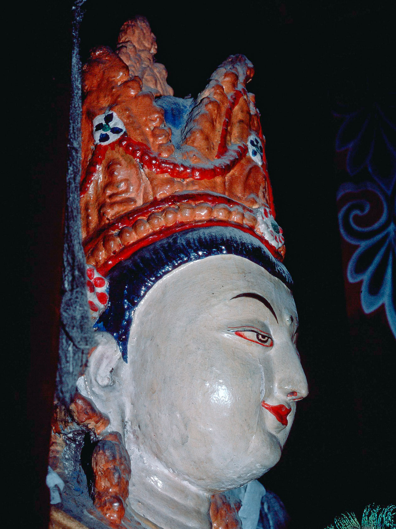 The Bodhisattva has a round full face with a straight but thick nose (possibly repaired) and a strong chin.
