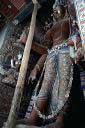 In principle the scenes of the Buddhas life are arranged in horizontal groups of medallions, reading from left to right, then right to left. The chronological sequence on the dhoti begins below the belt of Maitreyas right leg and progresse downwards, continuing in the opposite direction on the left leg and ending at the top. The scenes are numbered according their presumed narrative sequence.
