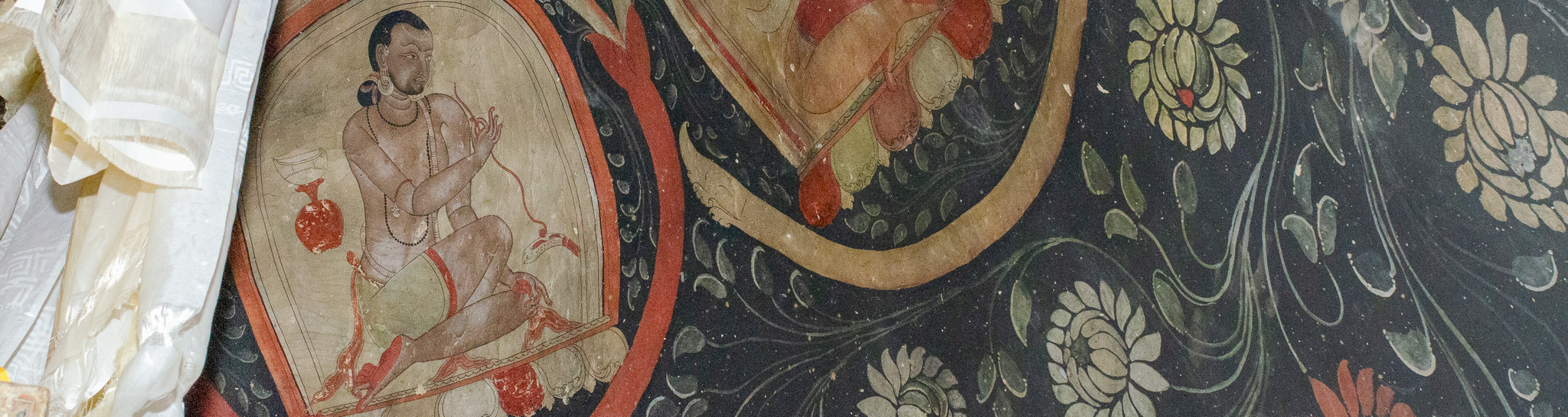 A mandala of Buddha Akṣobhya directly above the chörten tops the decoration of the cave. It is surrounded by eight great siddhas within a common lotus scroll. The lotus ring on which the mandala sits is also the central blossom of the scrollwork that expands towards the eight siddhas and then across the entire upper part of the cave against its black background. The bottom part of the cave has straight walls, the back wall covered with further murals. Read from left to right, there are the portraits of a teacher, Śākyamuni, Vajradhara, Vajrasattva, and Acala. The right-side wall is covered with a succession of mantras on a common lotus base.